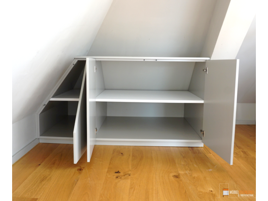 Dieses maßgefertigte Sideboard ist die perfekte Lösung für eine Nische mit zwei Dachschrägen. Das stilvolle Design fügt sich harmonisch ein und schafft gleichzeitig praktischen Stauraum für Bücher, Dokumente und andere persönliche Gegenstände - ideal für ein aufgeräumtes und modernes Wohnambiente.