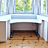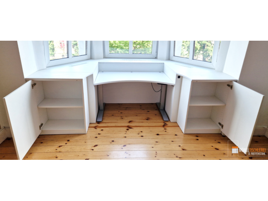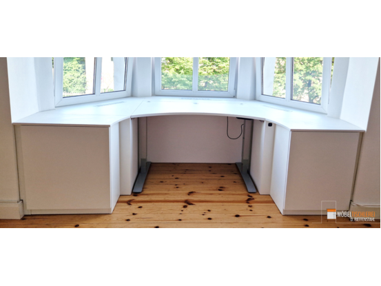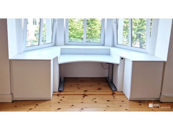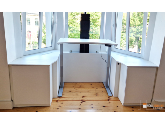 Dieser höhenverstellbare Schreibtisch ermöglicht es, sowohl sitzend als auch stehend zu arbeiten. Er ist maßgefertigt und passt sich perfekt dem Erker an, um den Raum optimal zu nutzen.