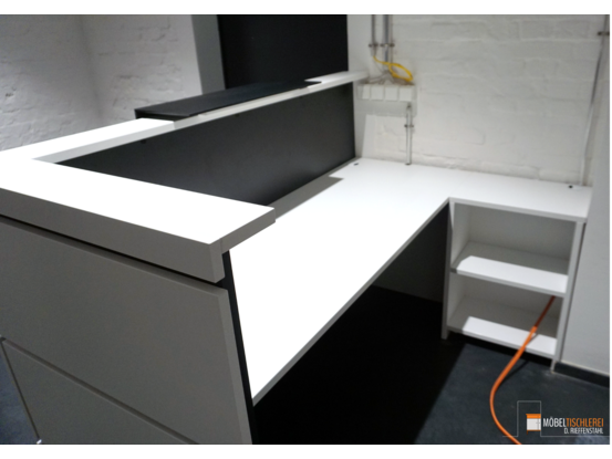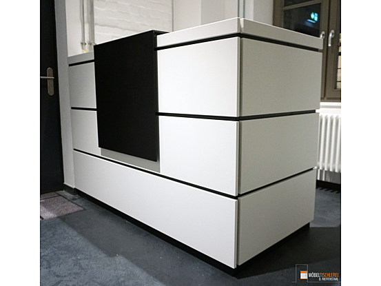 Dieser hochwertige Empfangstresen wurde speziell für eine IT-Firma entworfen und vereint modernes Möbeldesign mit funktionaler Eleganz. Die kontrastreiche Schwarz-Weiß-Optik verleiht dem Empfangsbereich eine zeitlose, professionelle Ausstrahlung. Als maßgefertigte Möbellösung fügt sich der Tresen perfekt in das moderne Arbeitsumfeld ein.