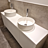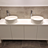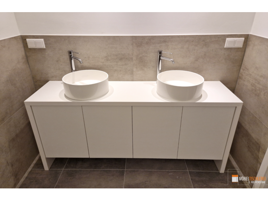 Dieser individuell angefertigte Doppelwaschtisch wurde speziell für die Kundentoilette eines Spas konzipiert. Er bietet großzügigen Raum für zwei Waschbecken und zusätzlichen Stauraum für Handtücher, Seifen und andere Pflegeprodukte.