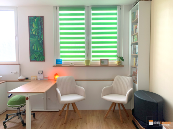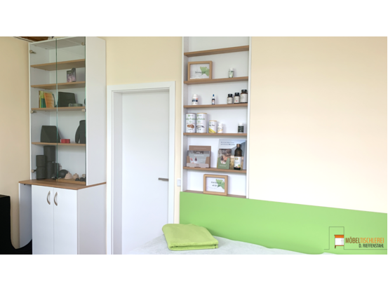 Dieser Wellnessraum setzt auf eine harmonische Kombination aus Weiß, Corbridge Eiche und Grün, die für eine beruhigende und einladende Atmosphäre sorgt. Die hochwertigen Materialien und die individuelle Raumgestaltung bieten eine funktionale Möbellösung, die sich perfekt in den Raum integriert und für maximale Entspannung sorgt.