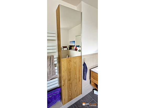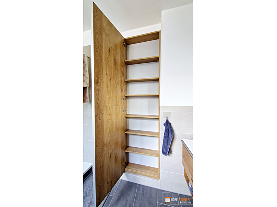 Dieser Badschrank wurde passend zum Waschtisch gefertigt und besticht durch sein zeitloses Eiche-Dekor. Der flächenbündige Spiegel auf der Front und die schrankhohe Aluminiumgriffleiste verleihen dem Schrank eine elegante Optik. Im Inneren bieten flexible Einlegeböden ausreichend Stauraum für Badutensilien und sorgen für Ordnung im Bad.