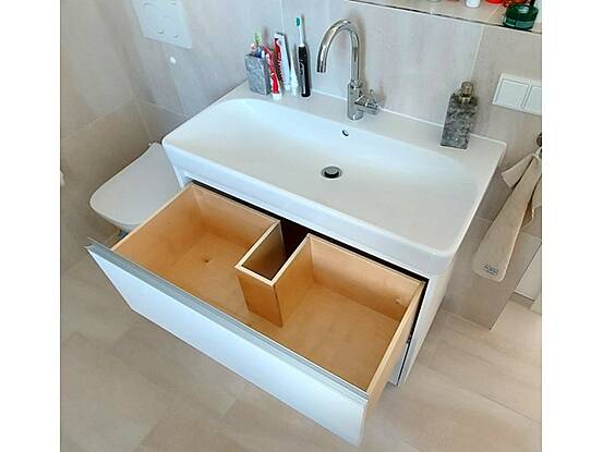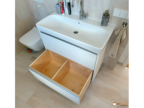 Dieser Unterschrank ist perfekt an die Größe des Waschbeckens angepasst. Die zwei Schubkästen mit dezenten Alu-Griffleisten (wahlweise mit Innenunterteilung) bieten praktischenStauraum für kleine Badutensilien.