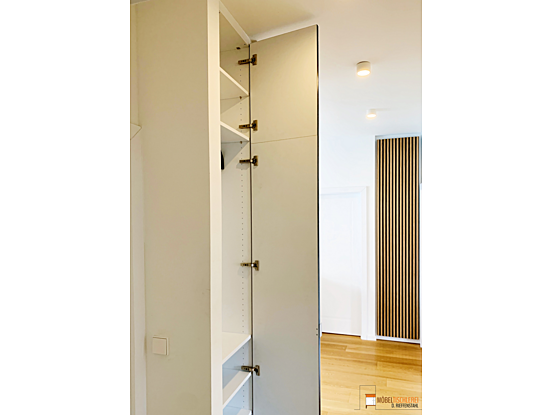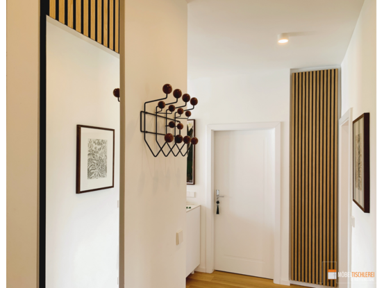 Diese maßgefertigten Flurschränke kombinieren stilvolles Design mit praktischer Schallabsorption. Die beliebten Akustikpaneele schmücken nicht nur die Schranktüren, sondern verbessern auch die Raumakustik. Ein außen angebrachter Spiegel ermöglicht die schnelle Outfitkontrolle vor dem Verlassen des Hauses. Dank der harmonischen Farbgebung, abgestimmt auf den Bodenbelag, fügen sich die Möbel nahtlos in das Gesamtbild des Flurs ein.