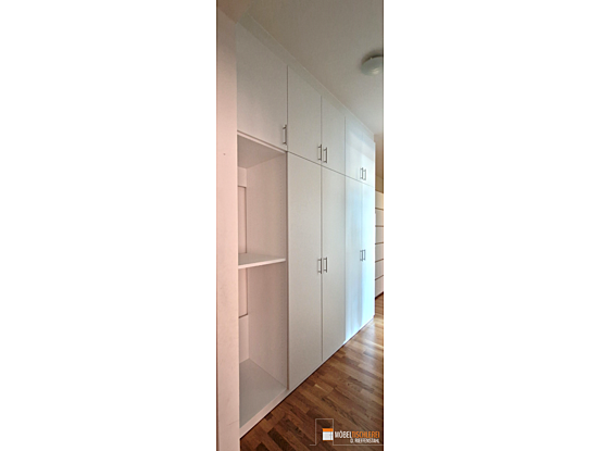 Dieser deckenhohe Flurschrank in Weiß kombiniert offene und geschlossene Elemente und bietet großzügigen Stauraum. Integrierte Garderobenstangen sorgen für eine praktische Aufbewahrung von Jacken und Mänteln. So entsteht eine aufgeräumte und stilvolle Lösung für den Eingangsbereich.