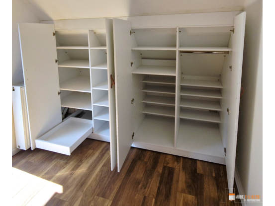 Dieser Kleiderschrank in Weiß mit eleganten Ledergriffen und einer Spiegelfront nutzt den Drempel optimal aus und bietet gleichzeitig viel Stauraum für Kleidung und Accessoires.