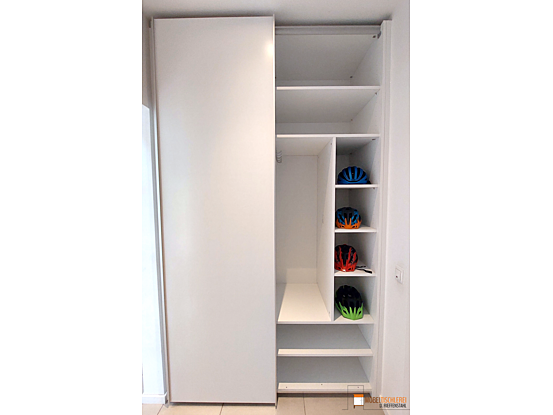 Dieser maßgeschneiderte Nischenschrank im Eingangsbereich überzeugt durch schlichte Eleganz. Die aluminiumfarbenen, schrankhohen Griffleisten setzen einen modernen Akzent. Beim Öffnen der Schiebetüren entfaltet sich eine geräumige Garderobe mit viel Stauraum für Schuhe, Jacken, Helme und mehr.