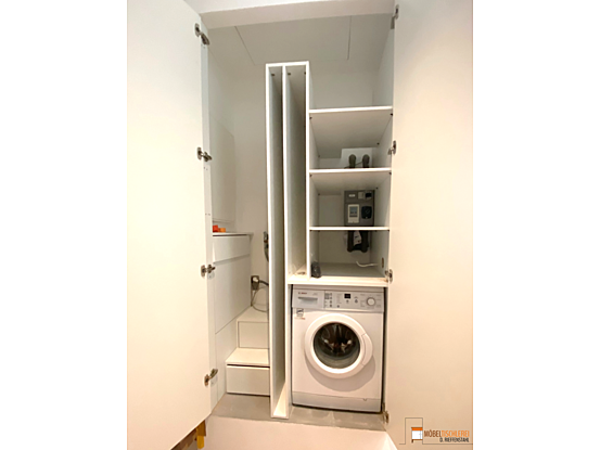 Dieser Schrank fügt sich nahtlos in eine Flurnische ein und besticht durch seine asymmetrischen Fräsungen auf den weiß lackierten Türen. Beim Öffnen zeigt sich ein wahres Multifunktionstalent: Neben Platz für eine Waschmaschine und Zubehör bieten die Schubkästen zugleich eine praktische Treppe, um an Deckeninstallationen zu gelangen. Zusätzliche Schrankeinbauten sorgen für noch mehr Stauraum.