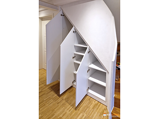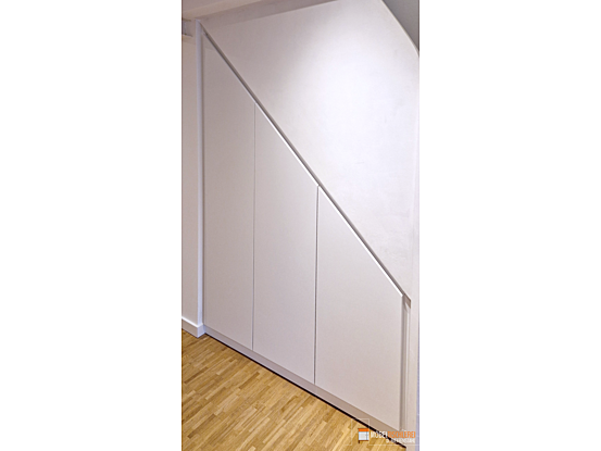 Dieser maßgeschneiderte Treppenschrank in Weiß nutzt den verfügbaren Raum unter der Treppe ideal aus. Perfekt eingebaut, schafft er zusätzlichen Stauraum und fügt sich harmonisch in den Flur ein.