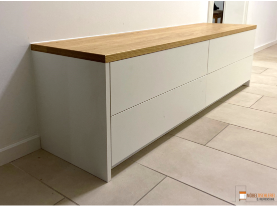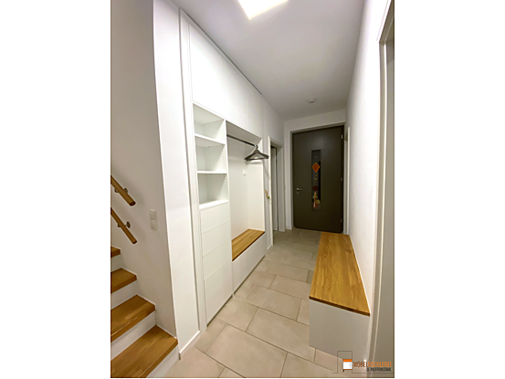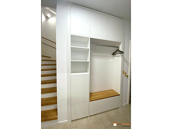 Willkommen zu Hause! Diese geräumige Flurgarderobe in Weiß mit Eiche-Akzenten ist perfekt in eine Nische integriert. Mit voll ausziehbaren Schubkästen und einer praktischen Sitzbank, die weiteren Stauraum bietet, lässt sich der Flurbereich ordentlich und stilvoll gestalten.