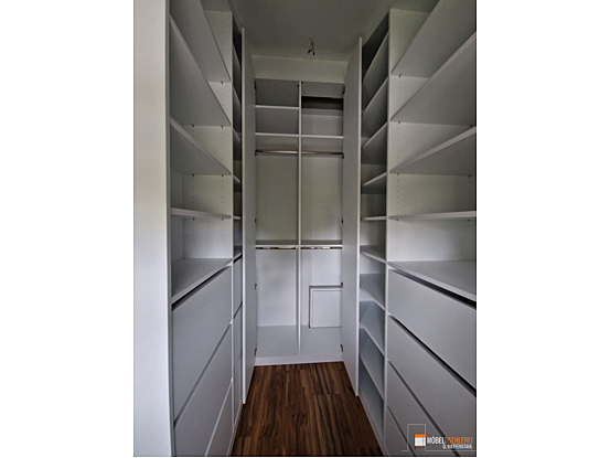 Trotz kompakter Maße (180×300 cm) bietet diese Ankleide dank zahlreicher Regale und Schubkästen maximalen Stauraum und eine durchdachte Ordnung.