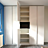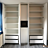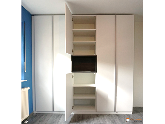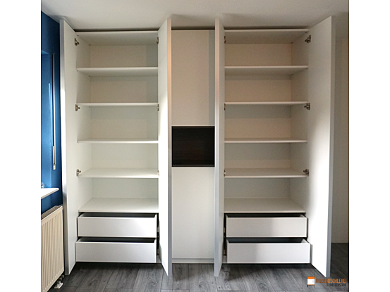 Der Kleiderschrank besticht durch ein mittig eingebautes, offenes Regal in Ulme Onyx, das Dekorationen perfekt in Szene setzt. Die türhohen Alugriffleisten runden das Design ab. Im Inneren bieten Schubkästen und flexibel anpassbare Einlegeböden vielseitigen Stauraum.