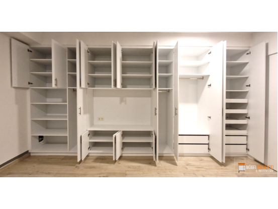 Diese geräumige Schrankwand bietet viel Stauraum für Kleidung und andere Gegenstände. Diese elegante Lösung sorgt für Ordnung und fügt sich harmonisch ins Raumkonzept ein.