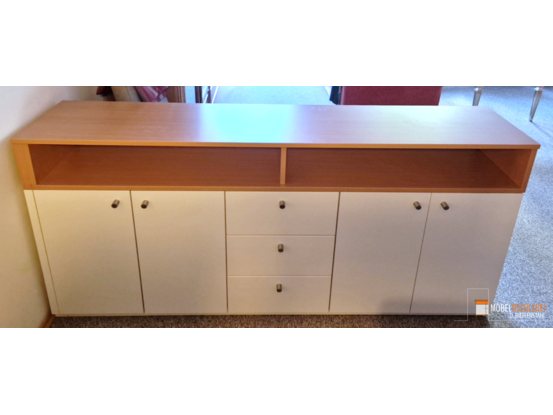 Dieses nahezu freistehende Sideboard dient als eleganter Raumteiler, der dezent den Wohn- vom Essbereich trennt. Das schlichte Design in Weiß wird durch den offenen Aufsatz im Buchedekor und die dezenten Knäufe ergänzt, wodurch dem Sideboard eine zeitlose Eleganz verliehen wird. Es fügt sich harmonisch in das bestehende Mobiliar ein und sorgt für eine stilvolle Aufteilung des Raums.