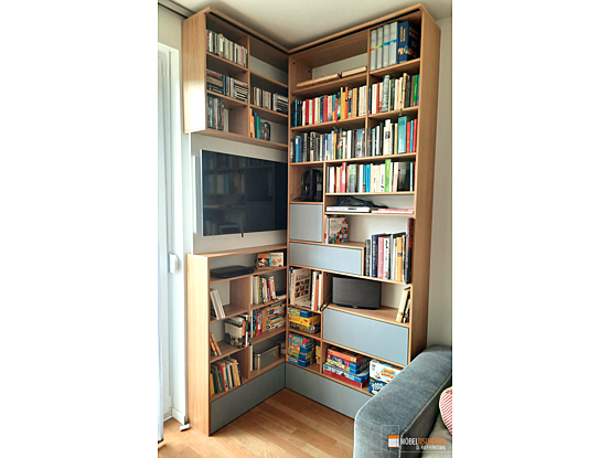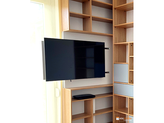 Dieses maßgefertigte TV-Eckregal überzeugt durch seine asymmetrische Gestaltung in Grau und Eiche-Dekor. LED-Bänder in der Deckplatte sorgen für stimmungsvolle Beleuchtung. Besonderes Highlight: Der integrierte Fernseher lässt sich bei Bedarf seitlich herausziehen – funktional und elegant zugleich.