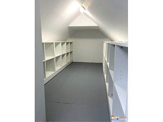 Dachböden werden oft zum chaotischen Abstellraum – nicht hier! Dieses maßgefertigte Aktenlager nutzt den Platz optimal und schafft unsichtbaren, strukturierten Stauraum. 19 gleich aufgebaute Schränke mit vier Fächern für Aktenordner lassen sich dank integrierter Rollen mühelos hervorziehen. Dahinter verbirgt sich zusätzlicher Stauraum, der die Dachschräge effizient nutzt – für maximale Ordnung und Funktionalität.