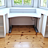 Dieser höhenverstellbare Schreibtisch ermöglicht es, sowohl sitzend als auch stehend zu arbeiten. Er ist maßgefertigt und passt sich perfekt dem Erker an, um den Raum optimal zu nutzen.