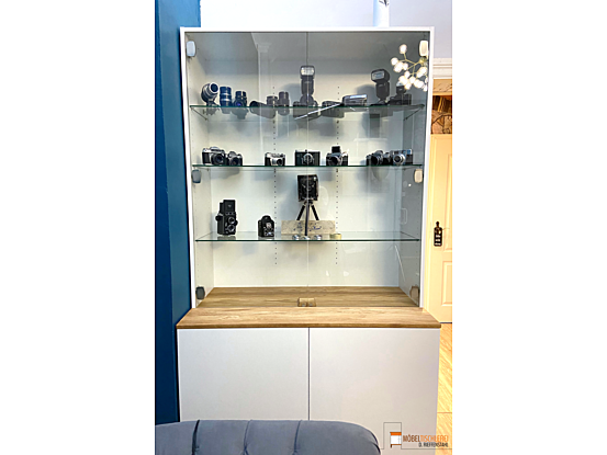 Diese Kameravitrine bietet im oberen Element eine ideale Präsentationsfläche, während der untere Bereich großzügigen Stauraum für größeres Zubehör bietet. Ideal für Fotografen, die ihre Ausrüstung ordentlich und professionell zur Schau stellen möchten.