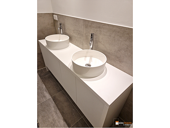 Dieser individuell angefertigte Doppelwaschtisch wurde speziell für die Kundentoilette eines Spas konzipiert. Er bietet großzügigen Raum für zwei Waschbecken und zusätzlichen Stauraum für Handtücher, Seifen und andere Pflegeprodukte.