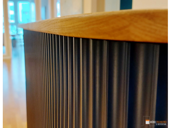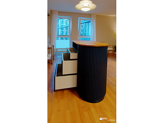 Dieser ovale Empfangstresen ist ein echter Hingucker im Eingangsbereich. Mit einer gebogenen Hohlkehlenplatte in edlem Dunkelblau und einer naturgeölten Eichenplatte oben sorgt er für einen stilvollen Empfang. Ideal, um Besucher herzlich willkommen zu heißen und einen bleibenden Eindruck zu hinterlassen.