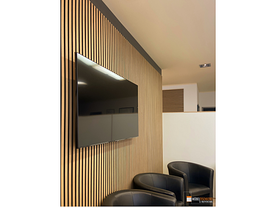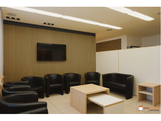 In dieser Arztpraxis sorgen Akustikpaneele aus Eiche für schallabsorbierende Trennung zwischen Wartebereich und Empfangsbereich. Sie bieten nicht nur Diskretion, sondern auch ein gemütliches Ambiente. Der harmonische Kontrast zwischen der weißen Trennwand und den Paneelen wird durch einen stilvollen Beistelltisch und Ablagetisch abgerundet – eine funktionale und stilvolle Möbellösung für den Wartebereich.