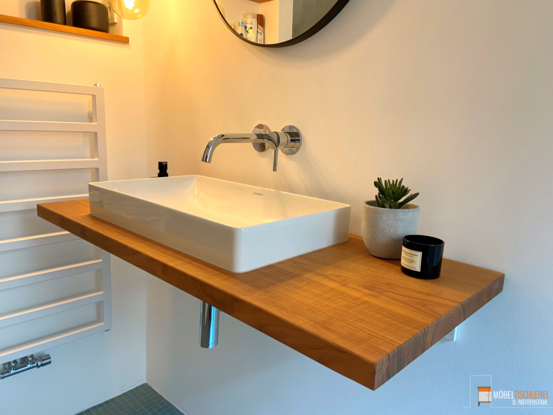 Dieser Waschtisch aus europäischer Kirsche kombiniert minimalistisches Design mit natürlicher Holzwärme. Er ist aus einem Stück gefertigt und wird durch unsichtbar befestigte Regalböden perfekt ergänzt. Gratleisten sorgen dafür, dass das Holz stabil bleibt, während die Ölbehandlung dem Waschtisch eine lange Lebensdauer verleiht.