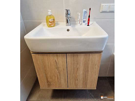 Dieser schwebende Waschtisch in Sonoma-Eiche-Dekor verbindet stilvolles Design mit praktischer Funktionalität und fügt sich perfekt in dieses Badezimmer ein.