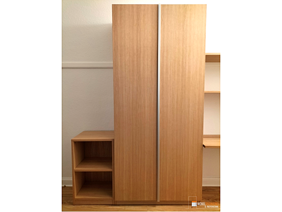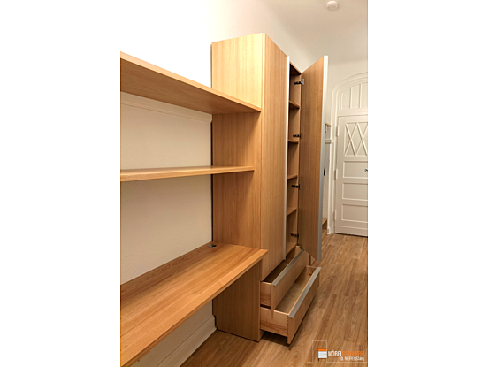 Diese Flurmöbel aus furnierter, naturgeölter Eiche bieten eine perfekte Kombination aus Ablagefläche und Stauraum. Die offenen und geschlossenen Elemente sorgen für eine vielseitige Nutzung. Türhohe Griffleisten, Haken und eine Kleiderstange aus Edelstahl setzen stilvolle Akzente und ergänzen das elegante Design. Die natürliche Holzoptik harmoniert wunderbar mit dem Boden und schafft eine warme und einladende Atmosphäre im Flur.