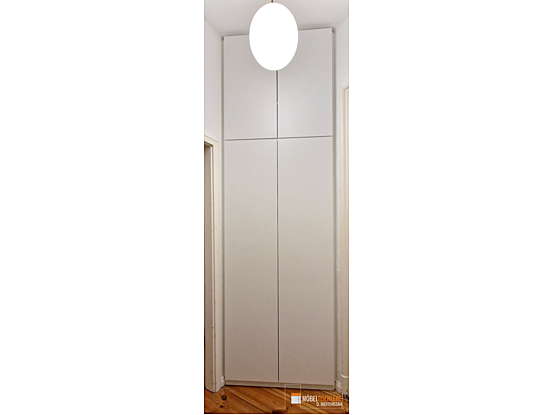 Dieser maßgefertigte Flureckschrank nutzt die spitzwinklige Nische optimal aus und schafft durch die Nutzung der Deckenhöhe zusätzlichen Stauraum. Mit variablen Einlegeböden lässt sich der Stauraum flexibel an die eigenen Bedürfnisse anpassen – für eine ordentliche und funktionale Lösung im Flur.