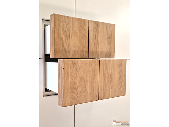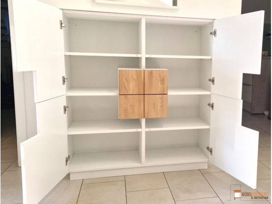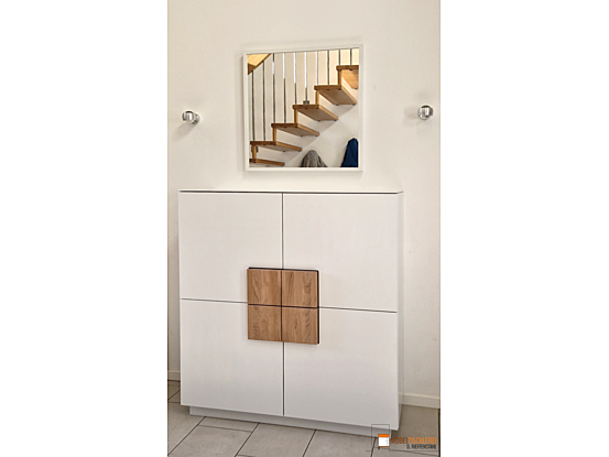 Diese Flurkommode in klassischem Weiß besticht durch ihre klare, symmetrische Form und quadratische Eiche-Fronten, die eine warme, natürliche Note verleihen. Die 38mm starken Eiche-Elemente schaffen eine dreidimensionale Optik und passen perfekt zum weißen Korpus – ein stilvoller Hingucker, der für Ordnung und Ruhe im Flur sorgt.