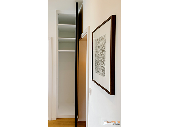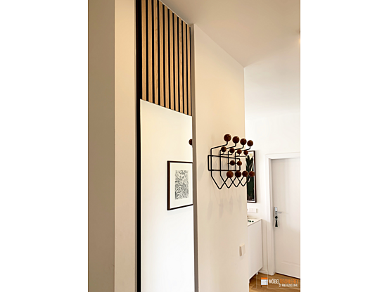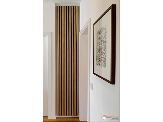 Diese maßgefertigten Flurschränke kombinieren stilvolles Design mit praktischer Schallabsorption. Die beliebten Akustikpaneele schmücken nicht nur die Schranktüren, sondern verbessern auch die Raumakustik. Ein außen angebrachter Spiegel ermöglicht die schnelle Outfitkontrolle vor dem Verlassen des Hauses. Dank der harmonischen Farbgebung, abgestimmt auf den Bodenbelag, fügen sich die Möbel nahtlos in das Gesamtbild des Flurs ein.