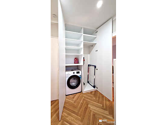 Dieser Flurschrank nutzt jede Ecke optimal – perfekt für kleine Wohnungen und Nischen. Er verbirgt sogar geschickt die Waschmaschine, sodass der Flur ordentlich und funktional bleibt.