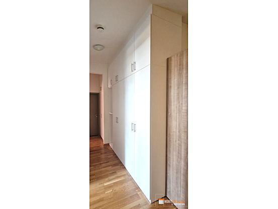 Dieser deckenhohe Flurschrank in Weiß kombiniert offene und geschlossene Elemente und bietet großzügigen Stauraum. Integrierte Garderobenstangen sorgen für eine praktische Aufbewahrung von Jacken und Mänteln. So entsteht eine aufgeräumte und stilvolle Lösung für den Eingangsbereich.