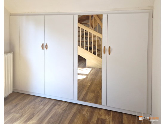 Dieser Kleiderschrank in Weiß mit eleganten Ledergriffen und einer Spiegelfront nutzt den Drempel optimal aus und bietet gleichzeitig viel Stauraum für Kleidung und Accessoires.