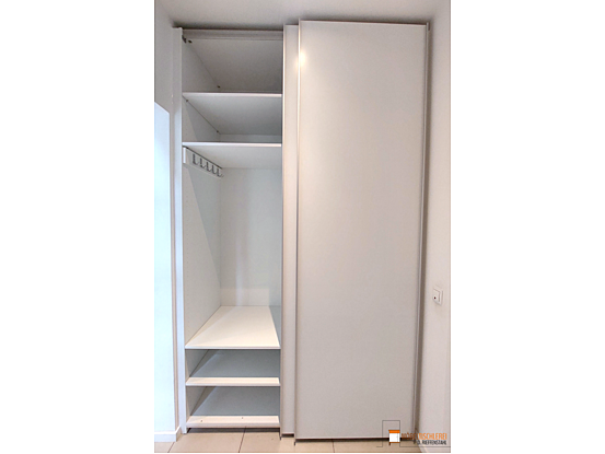 Dieser maßgeschneiderte Nischenschrank im Eingangsbereich überzeugt durch schlichte Eleganz. Die aluminiumfarbenen, schrankhohen Griffleisten setzen einen modernen Akzent. Beim Öffnen der Schiebetüren entfaltet sich eine geräumige Garderobe mit viel Stauraum für Schuhe, Jacken, Helme und mehr.