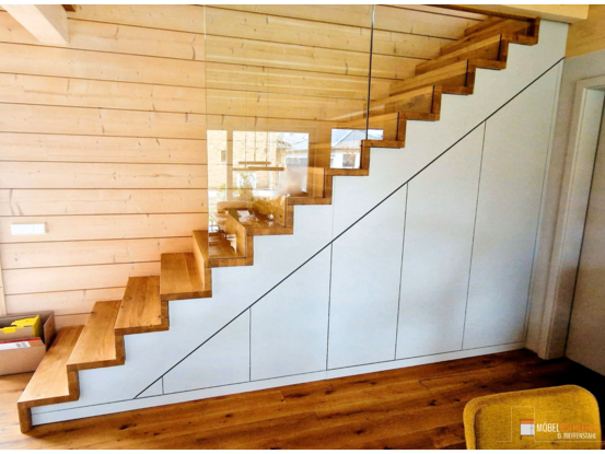 Dieser Treppenschrank in Weiß passt sich perfekt den einzelnen Stufen an und nutzt den Platz unter der Treppe optimal für zusätzlichen Stauraum.