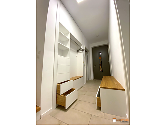 Willkommen zu Hause! Diese geräumige Flurgarderobe in Weiß mit Eiche-Akzenten ist perfekt in eine Nische integriert. Mit voll ausziehbaren Schubkästen und einer praktischen Sitzbank, die weiteren Stauraum bietet, lässt sich der Flurbereich ordentlich und stilvoll gestalten.