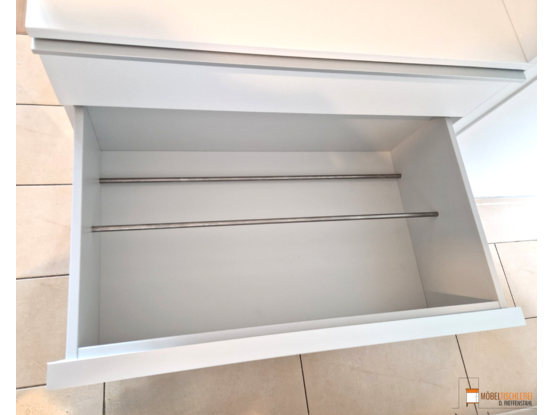 Diese minimalistische Garderobe in Weiß überzeugt mit durchdachtem Design. Sie bietet Platz für Jacken und Schuhe, während zusätzlicher Stauraum hinter den Türen und in den Schubkästen Platz für Accessoires und Schals schafft. Der seitlich angebrachte Spiegel ermöglicht einen schnellen Blick auf das Outfit, bevor man das Haus verlässt.