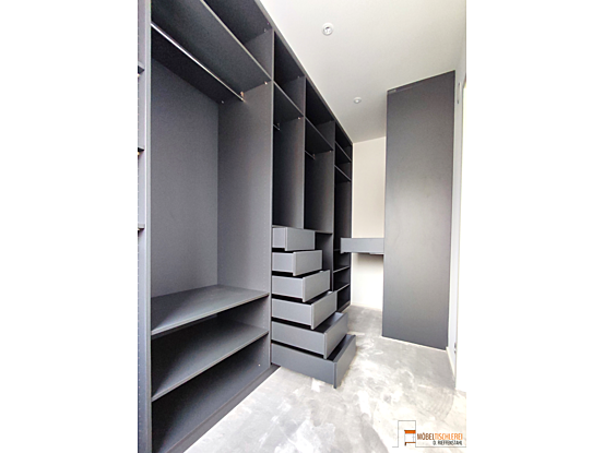 Dieses geräumige Ankleidezimmer in stilvollem Anthrazit bietet ausreichend Platz für Ihre gesamte Garderobe. Mit cleveren Ablageflächen und Staumöglichkeiten findet jedes Kleidungsstück seinen perfekten Platz.