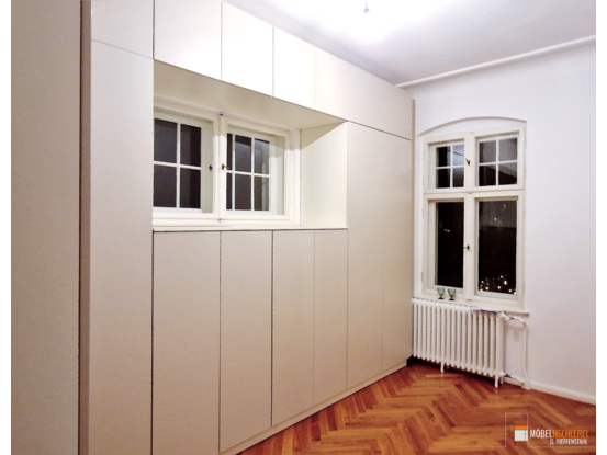 Dieses Ankleidezimmer nutzt den Raum perfekt, ohne überladen zu wirken. Die Beigetöne schaffen ein warmes, modernes Ambiente, das klassisch und einladend ist. Das geschickt integrierte Fenster sorgt für Tageslicht und Funktionalität. Die offene Regal-Ecke lockert die Optik auf und stellt ein stilvolles Designelement dar.