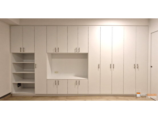 Diese geräumige Schrankwand bietet viel Stauraum für Kleidung und andere Gegenstände. Diese elegante Lösung sorgt für Ordnung und fügt sich harmonisch ins Raumkonzept ein.