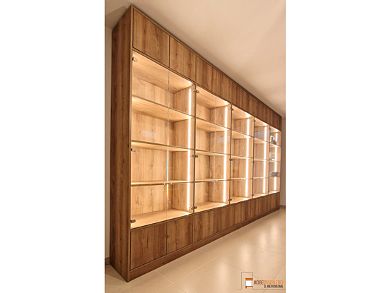 Dieses Regal in hochwertigem Eiche-Dekor besticht durch eine große, beleuchtete Vitrine, ideal zur Präsentation der Lieblingsstücke. Zusätzlicher Stauraum wird durch geschlossene Elemente geboten, die das Regal sowohl funktional als auch stilvoll abrunden.