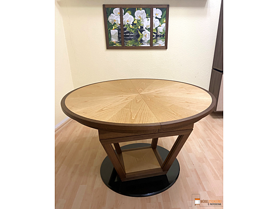 Der RoomStar Esstisch ist sowohl funktional als auch ein wahrer Blickfang in jedem Essbereich. Mit seinem eleganten Sternfurnier aus Esche und dem geräucherten Eichenrahmen schafft der Tisch eine stilvolle Atmosphäre. Die runde Form fördert eine angenehme Kommunikation, da bis zu sechs Personen direkten Blickkontakt haben können. Dank des integrierten Mittelstücks lässt sich der Tisch für bis zu zehn Personen erweitern, die angenehm an einer ovalen Tafel Platz nehmen können – perfekt für Familienessen oder gesellige Spieleabende.