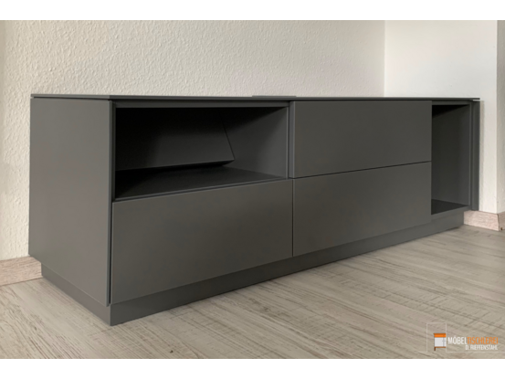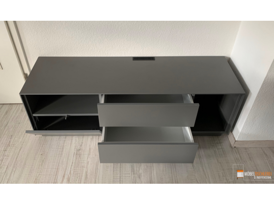 Dieses schiefergraue TV-Lowboard überzeugt durch klare Linien und moderne Zurückhaltung. Ausgestattet mit praktischen Schubkästen und einer Klapptür bietet es ausreichend Stauraum für Technik und Zubehör – ideal für ein aufgeräumtes Wohnzimmer mit stilvollem Charakter.