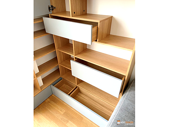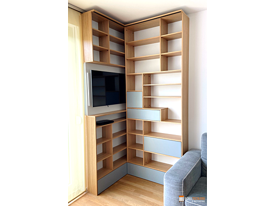 Dieses maßgefertigte TV-Eckregal überzeugt durch seine asymmetrische Gestaltung in Grau und Eiche-Dekor. LED-Bänder in der Deckplatte sorgen für stimmungsvolle Beleuchtung. Besonderes Highlight: Der integrierte Fernseher lässt sich bei Bedarf seitlich herausziehen – funktional und elegant zugleich.